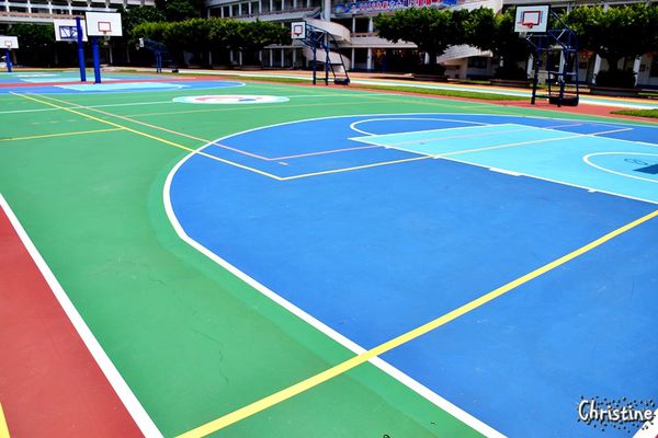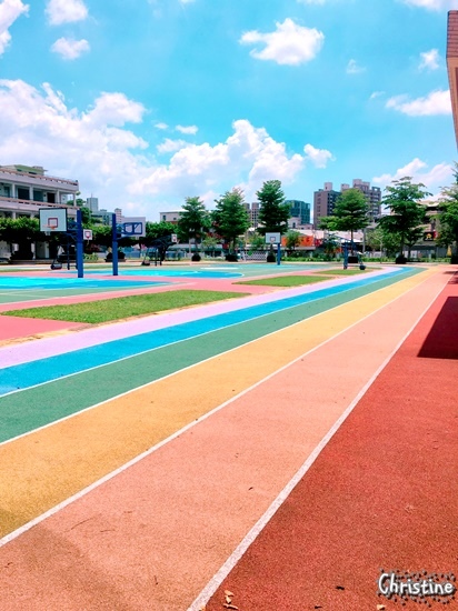 ▼ 跑道內的籃球場 , 也是五彩繽紛的