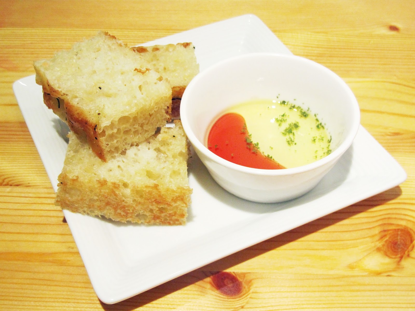 手作佛卡夏麵包,一旁附的是酸酸果醋加橄欖油的醬
