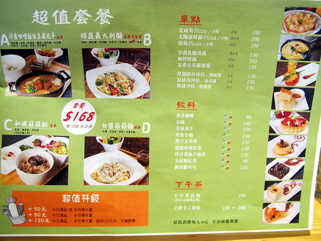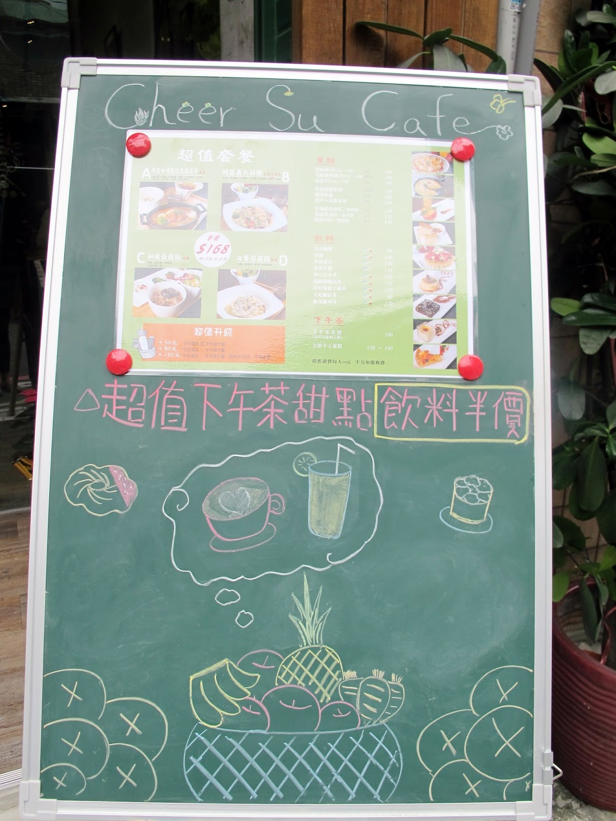 門口處有著菜單及寫著下午茶甜點、飲料還半價真的很超值