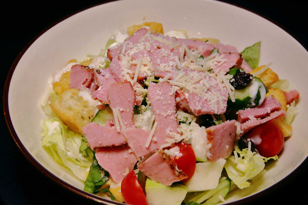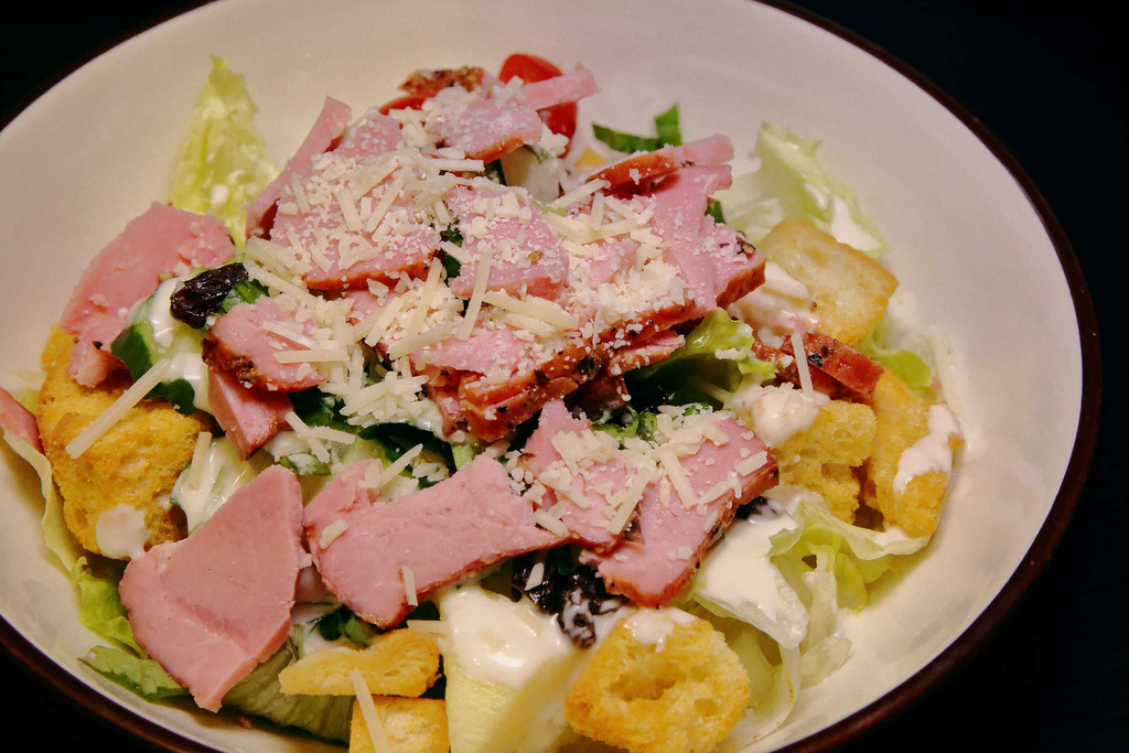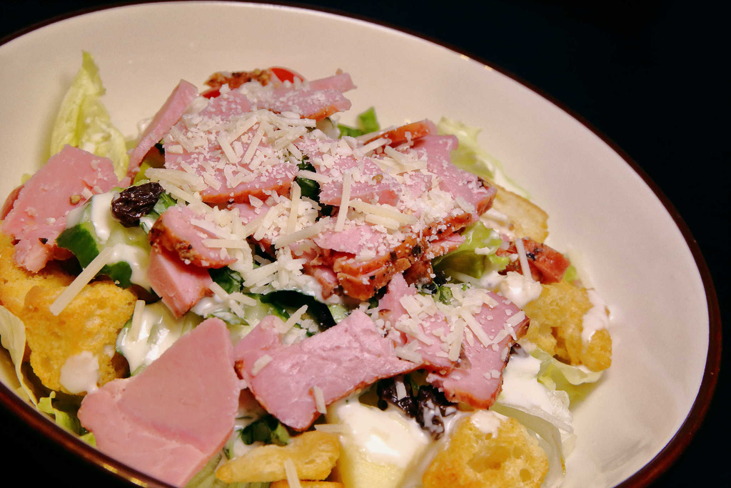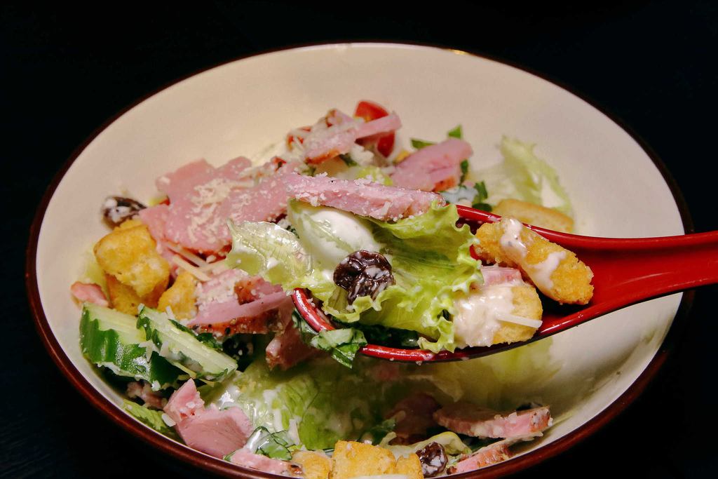 清脆可口的蘿蔓嫩葉拌著風味濃郁的凱撒醬汁,佐以金黃香酥的吐司方丁、鮮鹹的培根碎片,上頭再灑滿撒滿