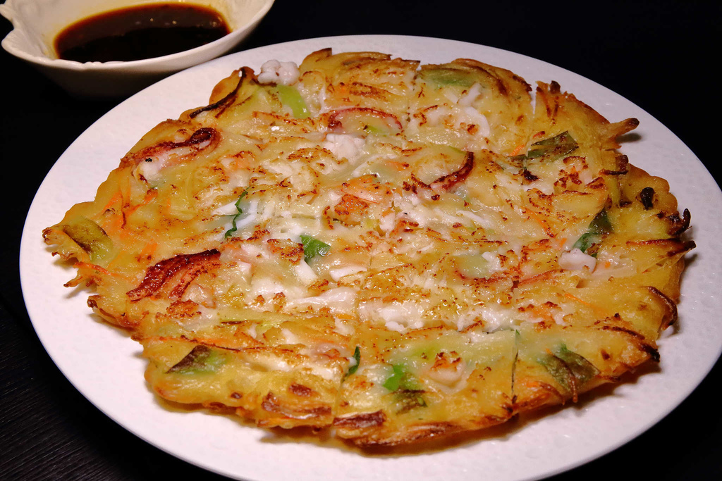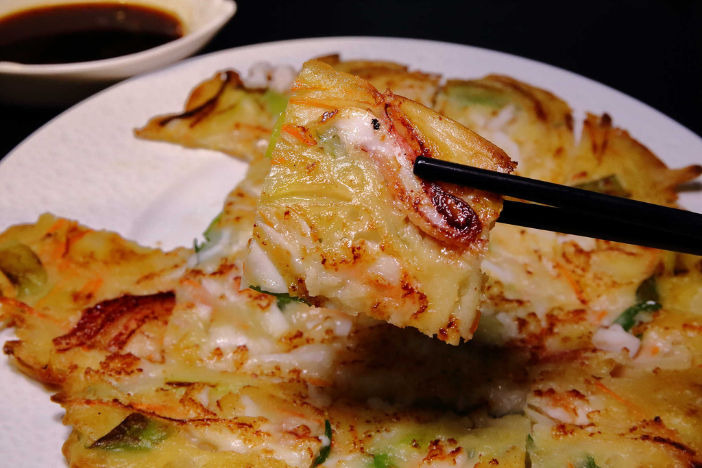 海鮮煎餅要煎到酥脆才好吃,一定要ㄎㄠˊㄎㄠˊㄎㄠˊ的口感,搭配彈牙的蝦子跟花枝,啊〜海洋的鮮味濃