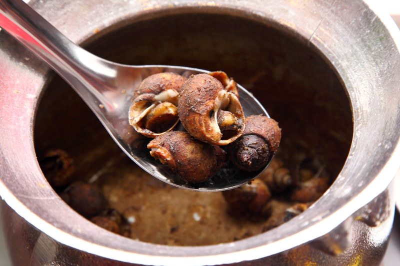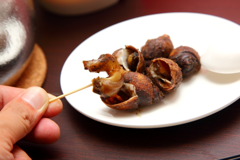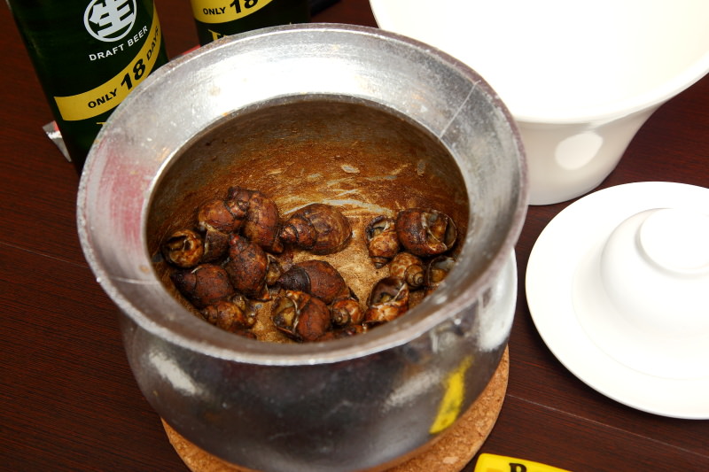 一品活蝦的鳳螺跟胡椒蝦一樣,同樣都是先將食材處理好後,直接就在鐵鍋中乾燒料理完成,藉由炙熱的鐵鍋內的熱循環來燜熟鳳螺,並且靠著熱氣再將胡椒氣味滲入鳳螺之中,軟軟QQ的鳳螺帶著濃厚的胡椒氣,因為新鮮鳳螺的肉相當容易取出,一個接一個越吃越完全停不下來!