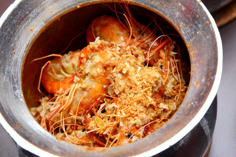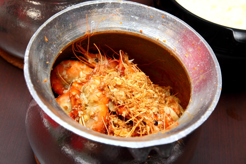 同樣也是一品活蝦的招牌菜,活蝦直接放進錫甕中加入大量大蒜及蒜酥一起在甕中拌炒,蒜頭接觸到炙熱的鐵鍋立刻飆出噴香的氣息,蒜頭甜香完全滲入活蝦當中,蒜頭釋放出來的甘甜味及微微蒜辣感充分融入Q彈蝦肉中,蒜酥酥香的口感憑添口感層次!同樣也是超下酒的好菜!