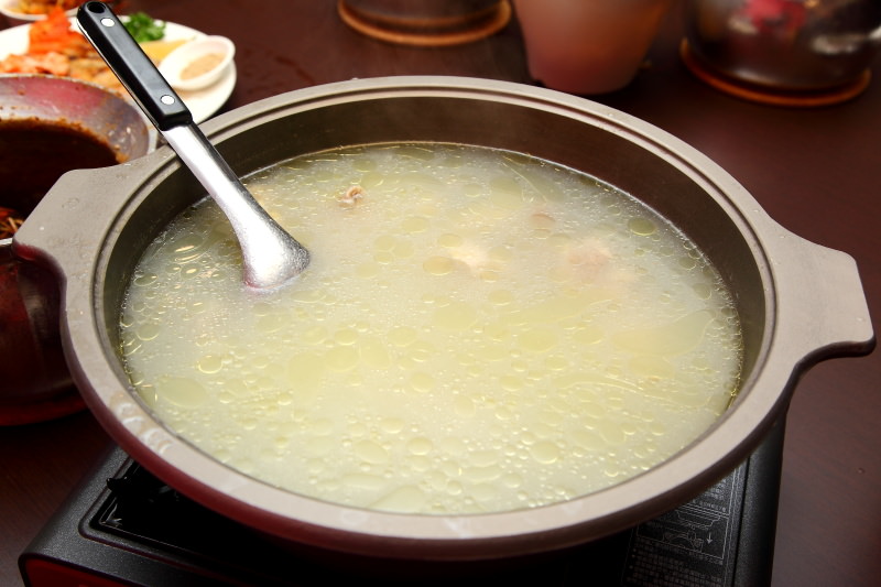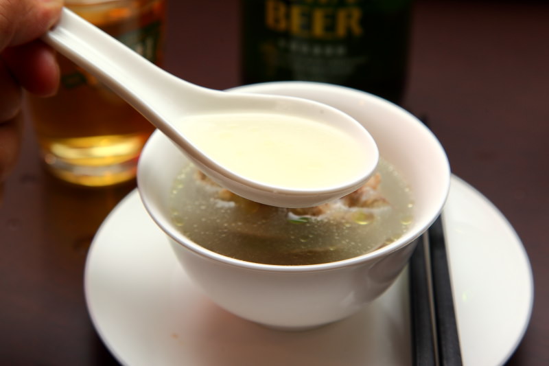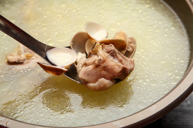 這鍋湯是用蒜頭、薑片跟蛤仔加上仿仔雞腿同燉煮,蒜頭完全煮的軟綿,蒜頭味道完全滲入湯中,每一口都能喝到滿滿的蒜香及蛤蠣鮮味,仿仔雞堅持每日直送的溫體雞,仿雞腿肉吸飽了湯頭的鮮味,肉質Q軟細緻