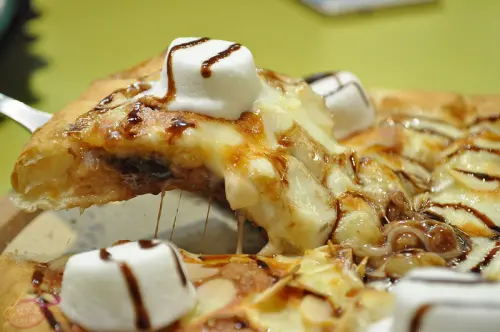 起司鋪在豬肉上,夾起豬肉,起司就緊緊的跟著肉片被送進嘴巴