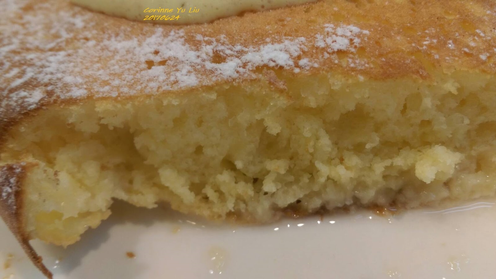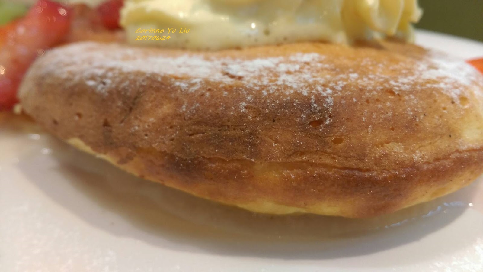 正圓形的厚鬆餅,裡面算是紮實的,口感略帶Q彈,我自己很喜歡。因為上面有糖粉,讓人感覺鬆餅本身就是甜的,單吃也不會膩。