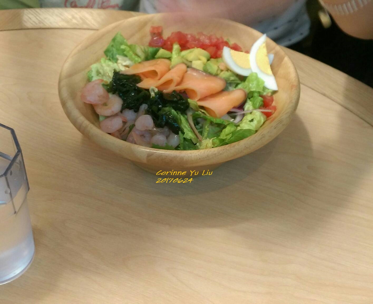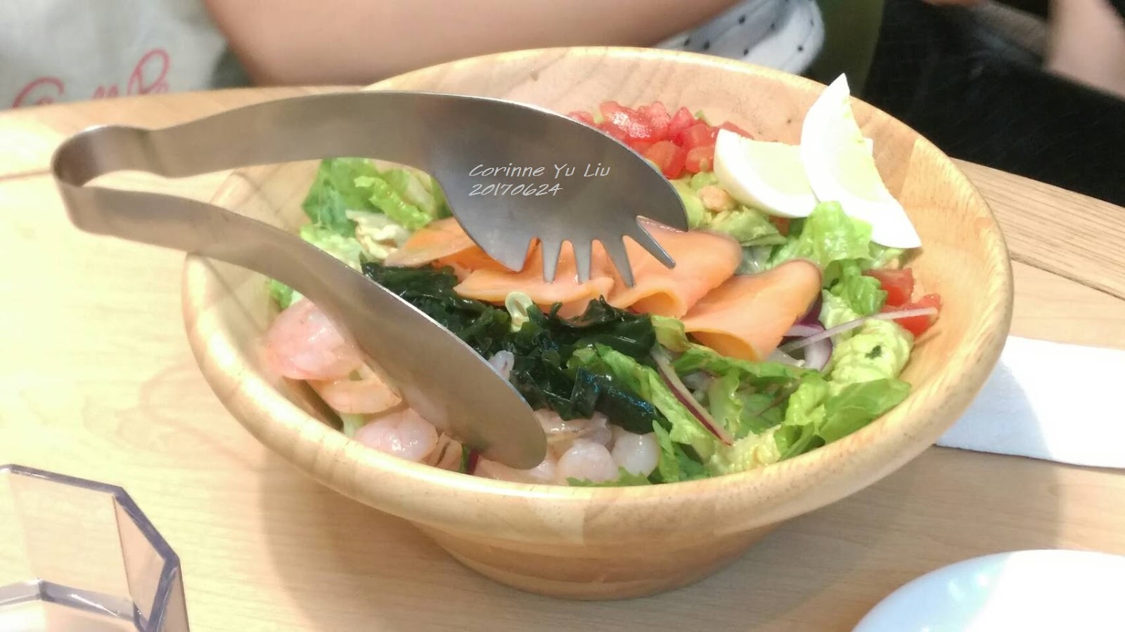 其實看起來不大,但是兩到三個女孩分食,我想是很足夠的。醬料感覺是和風醬,味道偏淡,吃不太出來醬料的味道。煙燻鮭魚的煙燻味我個人覺得是恰到好處,有一點點厚度吃起來很滿足,重點是新鮮!光沙拉就讓我吃得滿心歡喜(沒錯我很好收買)😆