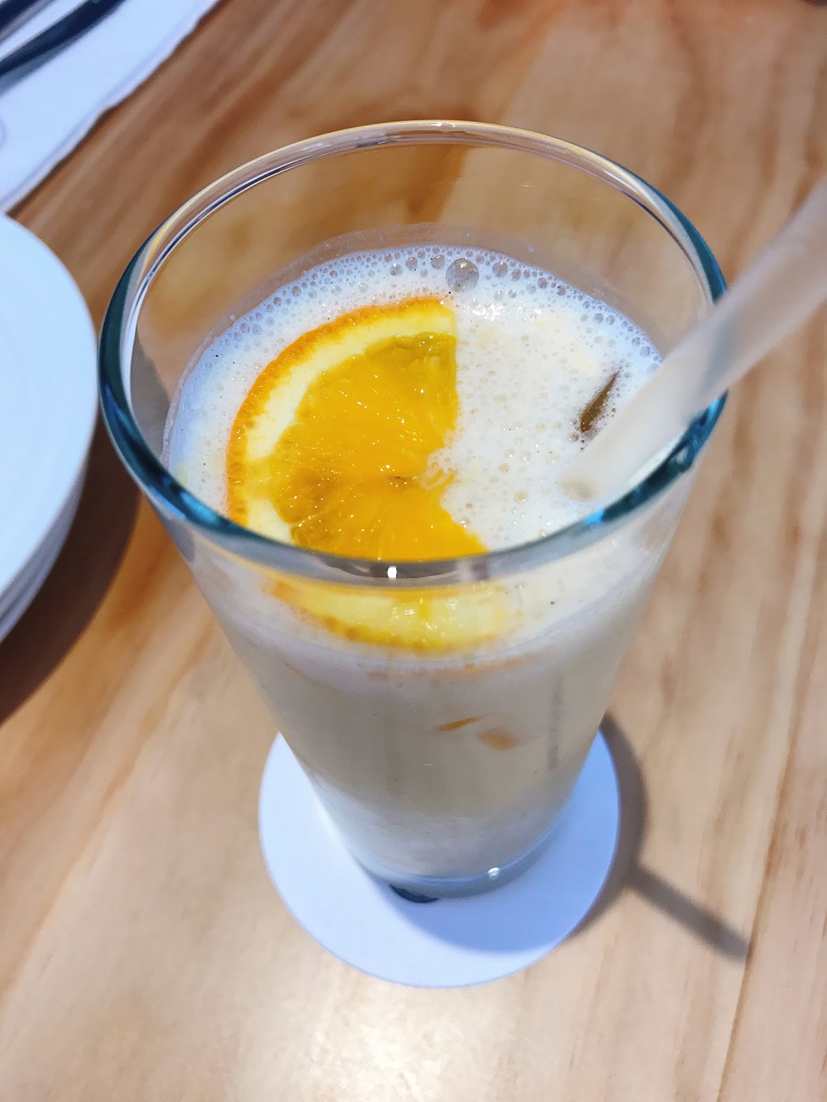 柳橙果露喝起來很濃郁卻又帶著水果牛奶的清新,酸中帶甜,相當不錯!