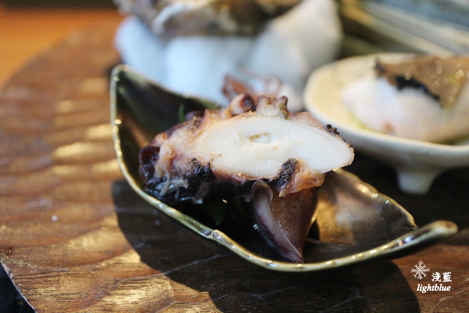 這一盤有用紅茶滷過的臺灣章魚,還有日本螢烏賊。章魚因為滷過,所以吃起來不會咬不斷,紅茶也只有淡淡的味道並不奇怪,而且不會像一般滷汁只是鹹味,這是帶有甘味的。螢烏賊裡頭有蛋,吃起來有海味但是不腥,好想再來一盤
