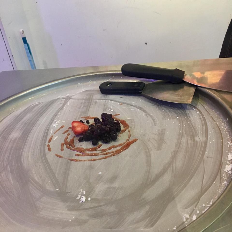 ↓之後再倒入類似冰淇淋的液體,填滿整個煎台,然後混著莓果攪拌