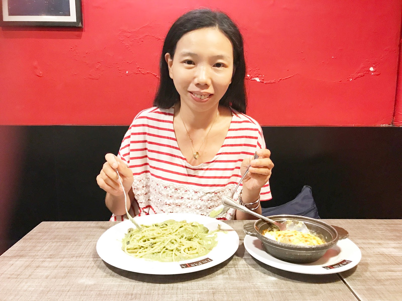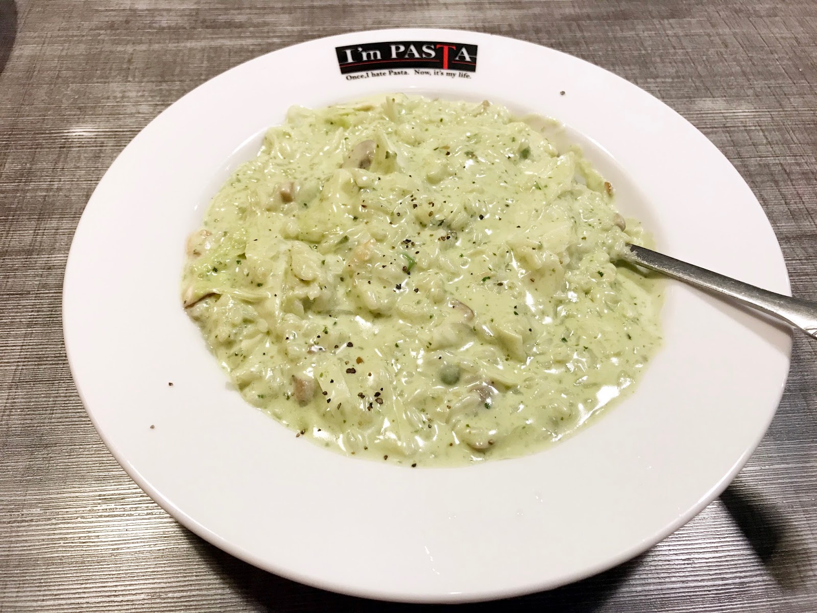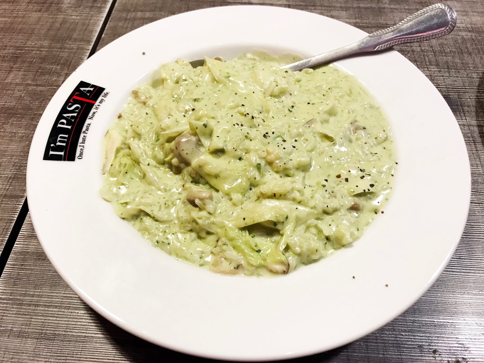 奶油青醬鮮菇義大利麵,青醬口感濃郁、麵條Q彈也是很美味