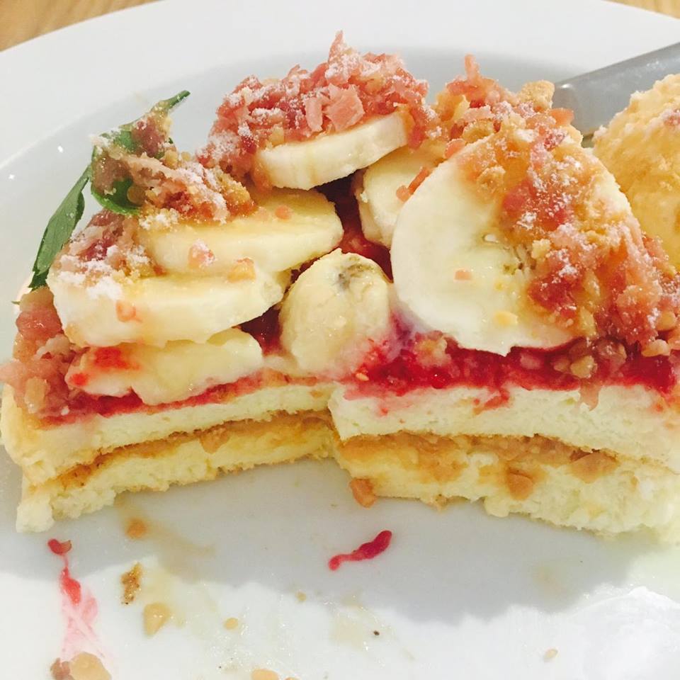 我今天點的是貓王~2層鬆餅中夾著有顆利的花生醬,上面鋪滿切片的香蕉,放上一顆香草冰淇淋,淋上焦糖,並灑上培根乾與些許海鹽,甜甜鹹鹹的,非常好吃,絕對是外面都吃不到的組合!