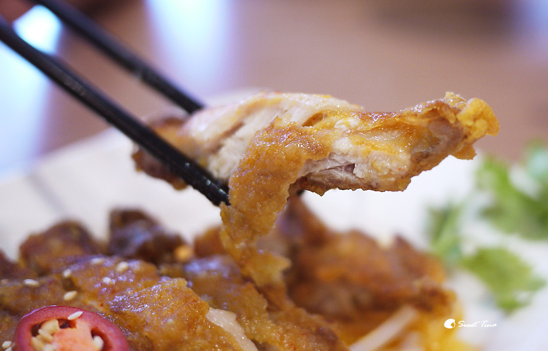 泰式椒麻雞 - 外皮酥脆,裡頭的雞肉還滿多汁的,口感上還不錯,底下的洋蔥沾著醬一起吃也很搭呢。