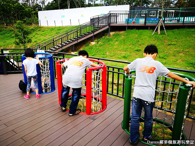 戶外親子遊樂設施也有設計爬繩索,可以訓練小朋友的手腳協調性,有點高度適合大朋友來玩
