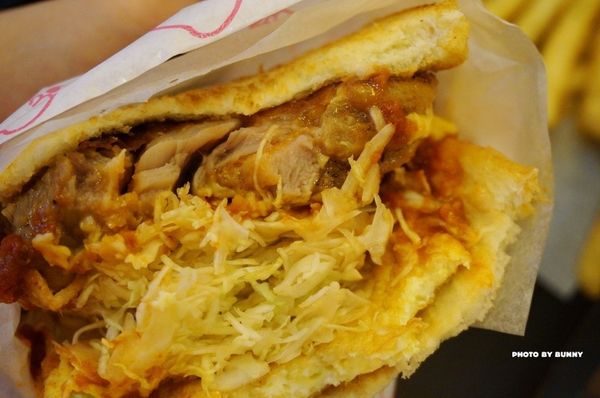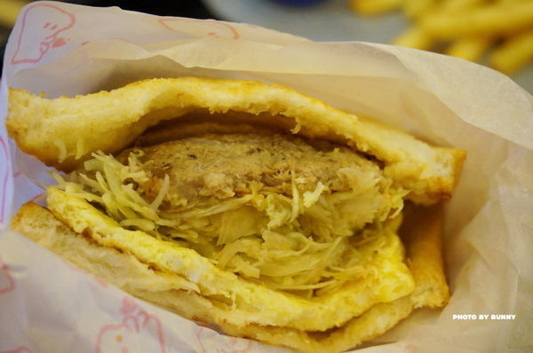 同樣有玉米蛋、起司片、蘿蔔片及大量的高麗菜絲