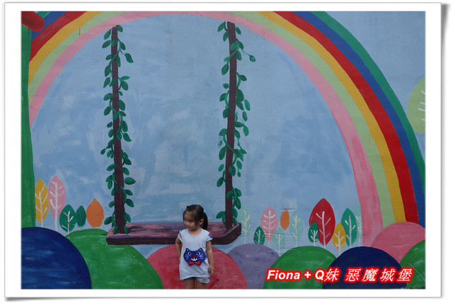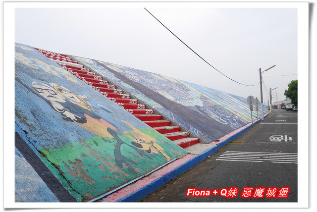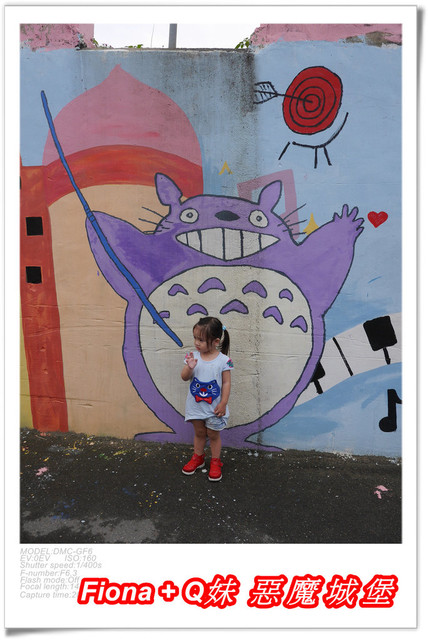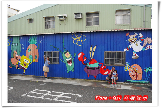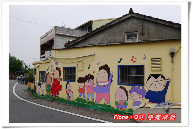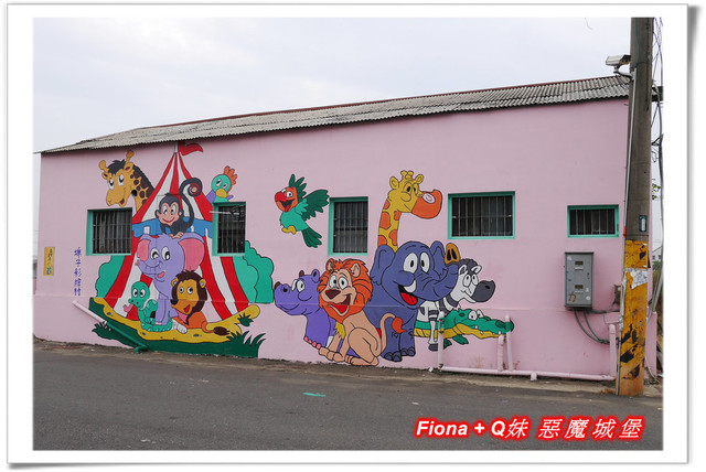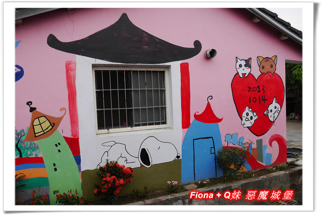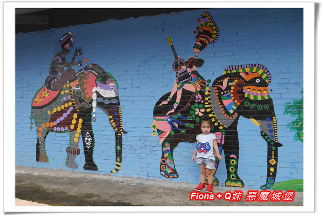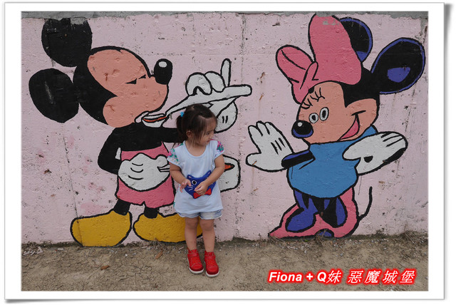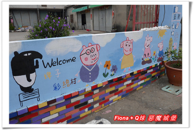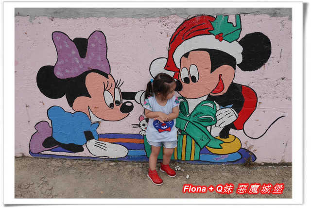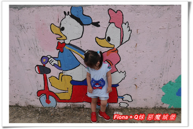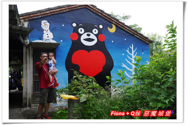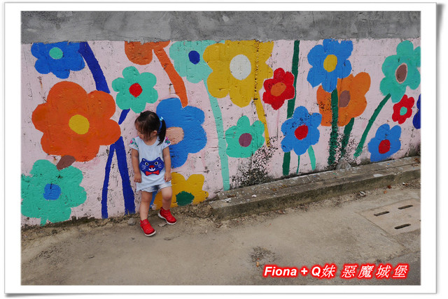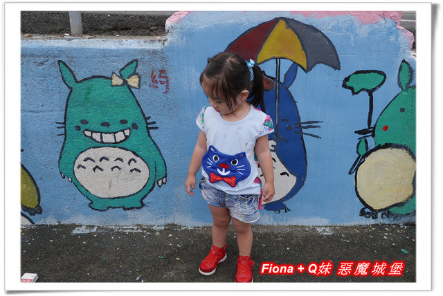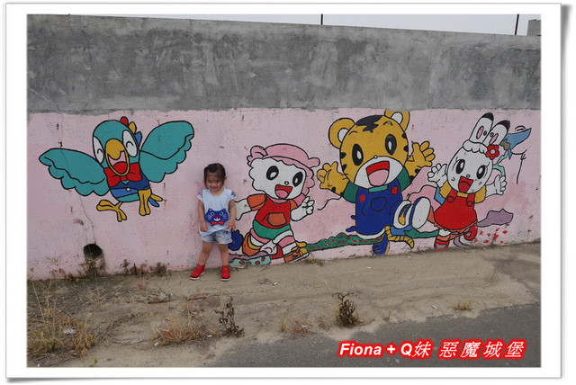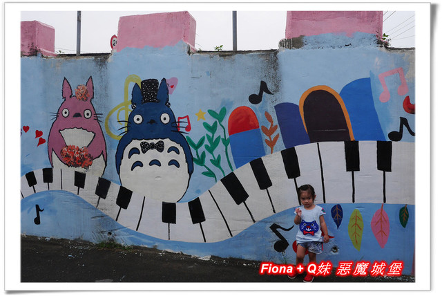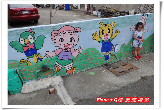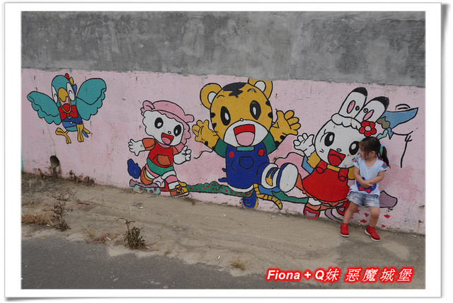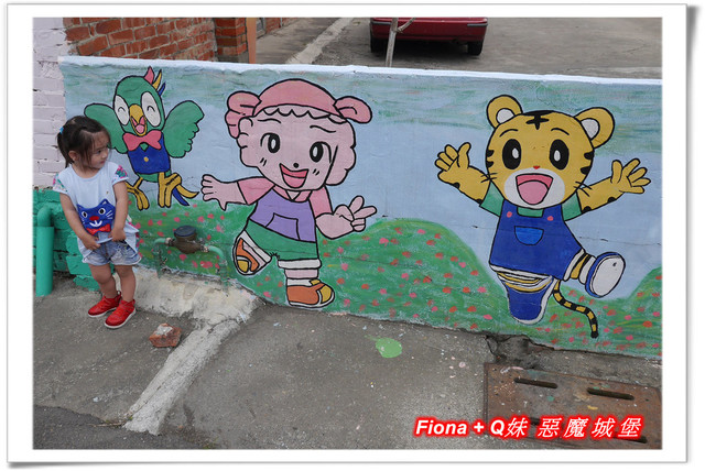 進入「埤子彩繪村」,首先看到的是一整面的卡通彩繪,原本不想停下來的,但是看到了Q妹最愛的巧虎,愛女心切的老爸立馬說要帶她去拍照,真是孝女無誤啦!