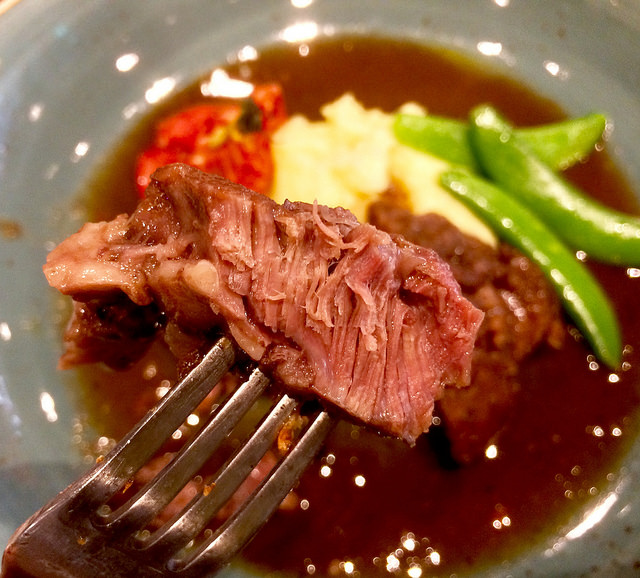 用整瓶紅酒燉煮的牛頰肉,叉子輕輕一剝肉就分開了