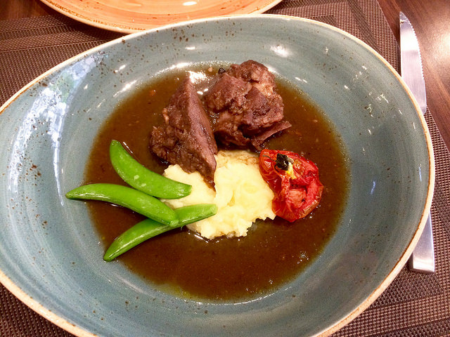 中間絲絲分明的條理, 軟而不柴;濃稠的紅酒醬汁在長時間燉煮後,酒精揮發只留下香味