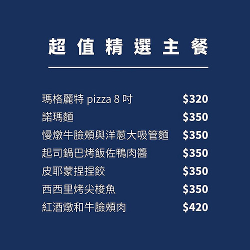 包含湯/開胃菜/沙拉(三選一) & 主餐 & 甜點 & 伯爵茶/美式咖啡(二選一)