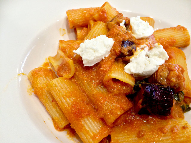 羊奶乳酪、茄子與羅勒的簡單搭配,同樣加上一點辣香腸、辣汁與茄汁的正統羅馬搭配