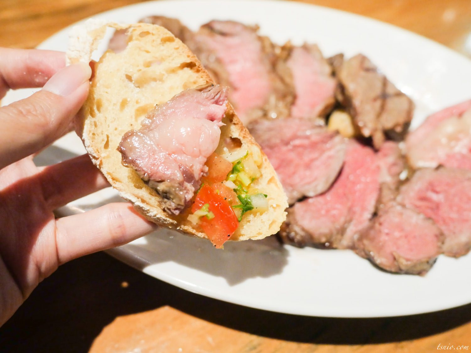 不過主廚建議我們將較多油花部分放在麵包上,再加上莎莎醬,再一口全部吃進嘴裡,莎莎醬會掩飾掉牛排的油味,而油脂香氣又蓋掉了莎莎醬洋蔥的嗆味,讓層次變得豐富又美味。