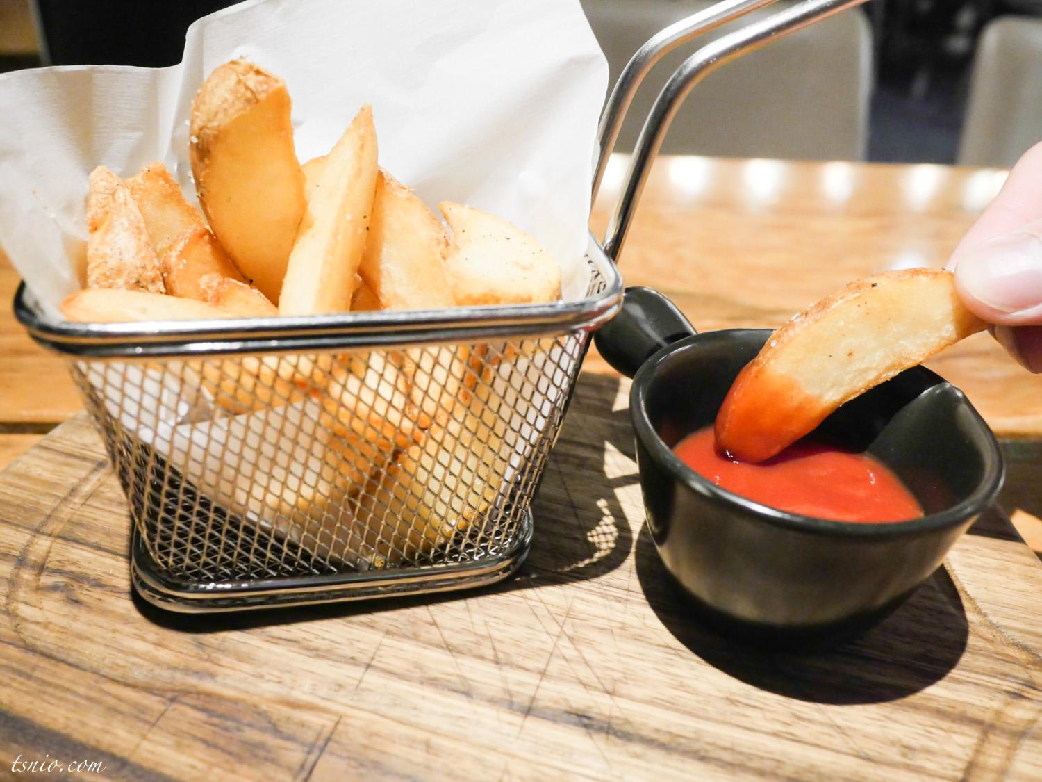 牛排的配菜是薯條,這是用整顆馬鈴薯所做成的。