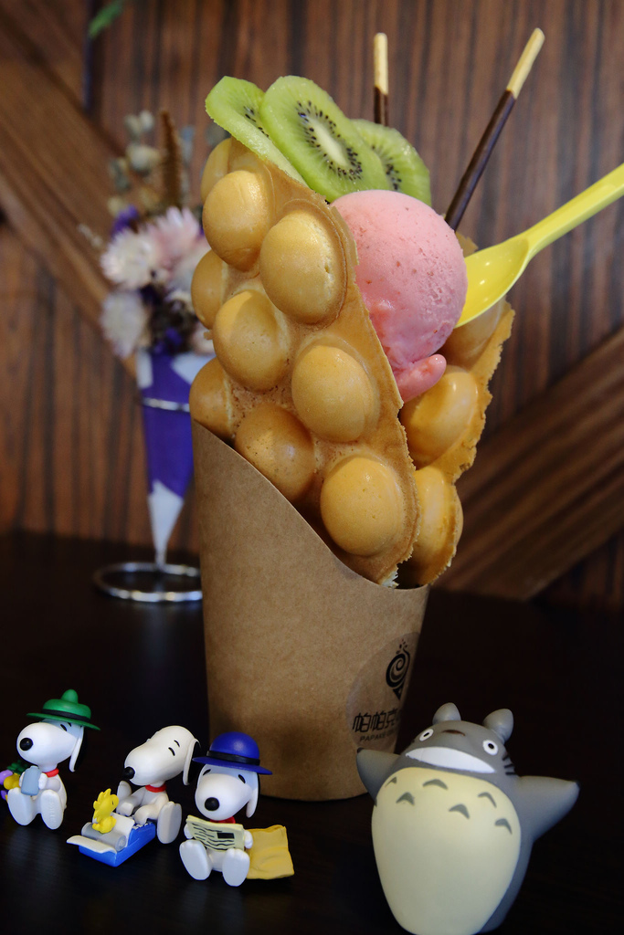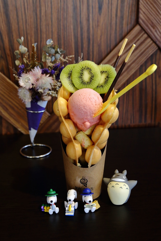 熱騰騰的雞蛋仔搭配著手工現做的義式冰淇淋,再鋪上了新鮮水果,能品嗜冷熱在口中交融的獨特滋味