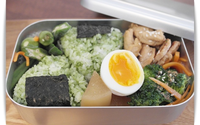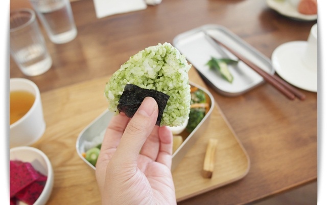 主食為抹茶海鹽飯糰搭配一些蔬菜及肉品。
