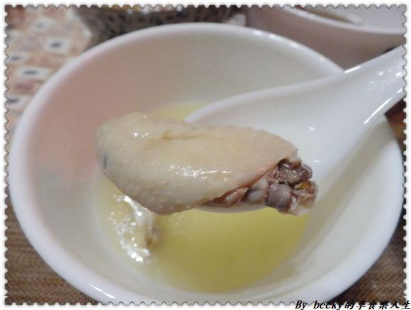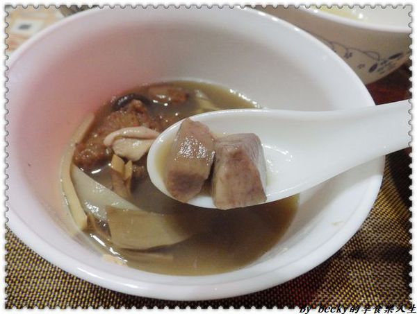 這個湯品連我也忍不住稱讚,味道甜鹹適中,還帶著陣陣香氣,它是用中藥材:當歸,黨蔘,玉竹,川芎,熟地,枸杞等等去熬煮,所以有著淡淡的中藥香,喝起來卻沒有中藥味。