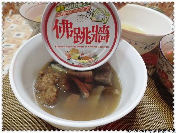 別看這麼小罐,裡頭該有的料都沒少喔!裡頭有:蝦米、香菇、栗子、魚皮、魷魚、脆筍、排骨酥、豬肚、杏鮑菇、芋頭、金華火腿等等,跟我們平常吃的佛跳牆相同。