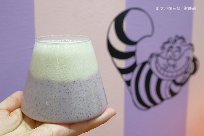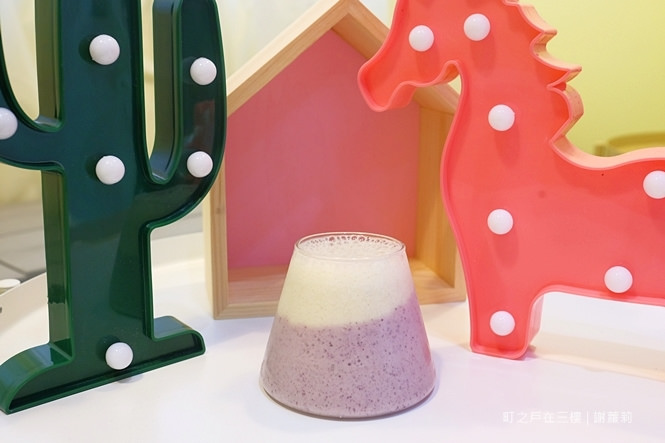 利用果汁顏色而做成漸層的富士山造型,小小杯還蠻精緻的,水果融合了藍莓、蔓越莓、香蕉及牛奶,淡淡的粉紫色,看起來還挺美的。