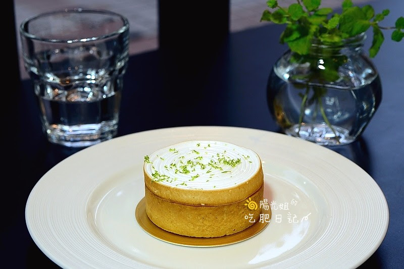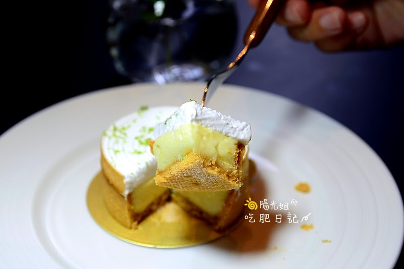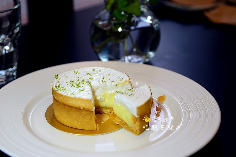 上層輕柔滑順微甜義式蛋白霜點綴著些許青綠檸檬皮,內餡是帶著金黃色澤和檸檬香氣、酸度,外層的塔皮則是酥脆厚度適中。