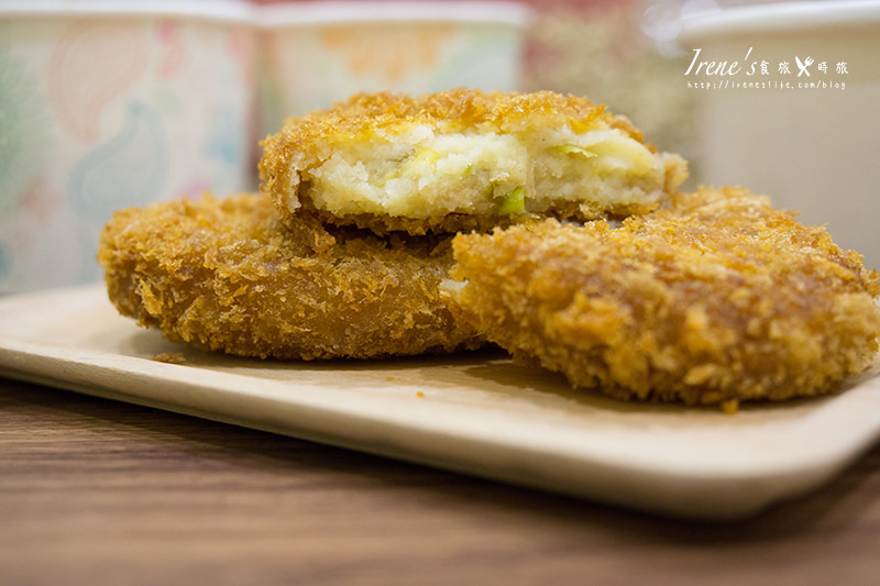 外酥內軟,看的到也吃的到可樂餅裏頭些許的野菜餡,沒有味道過重的肉味,
