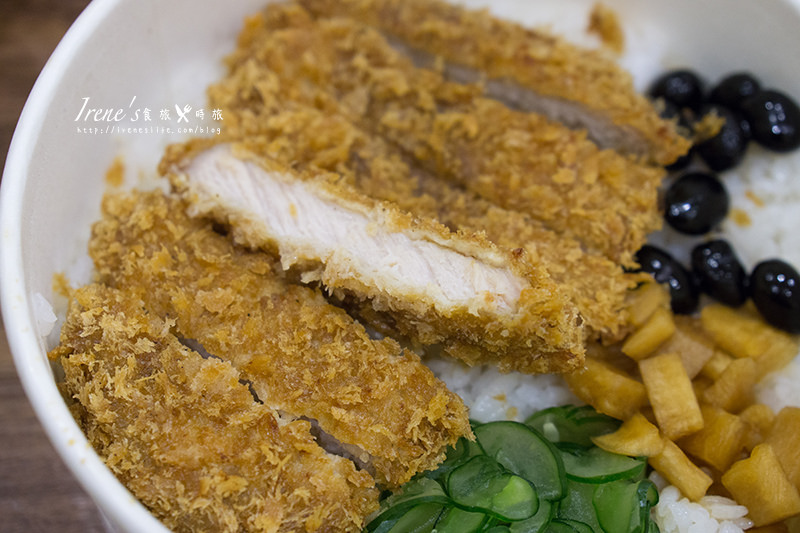 豬排跟白飯放置在一起,另外配有三款小菜,小黃瓜片、蘿蔔、黑豆,