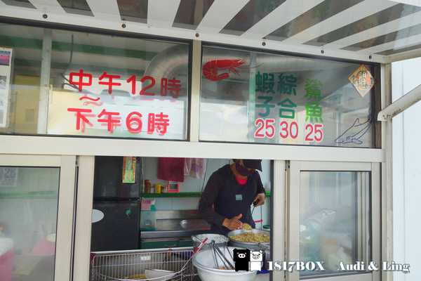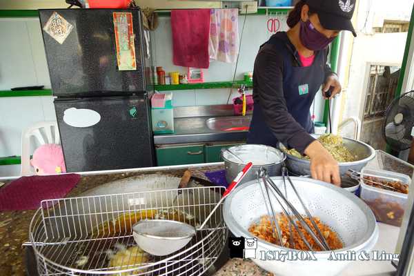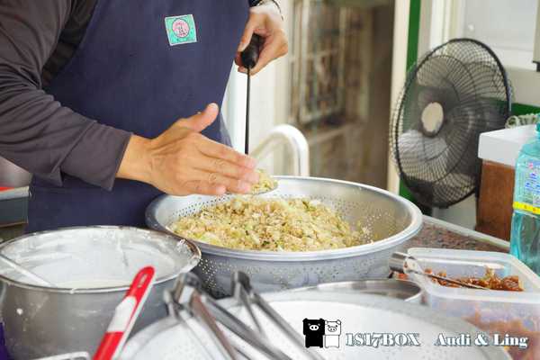 這家店只賣炸粿,將剁碎的高麗菜裝在一個圓形的杓子,再覆滿已經和水的麵粉,上頭最後加上一隻澎湖特產的狗蝦或是特製的鯊魚肉,一起放到熱油去炸,就完成一份又香又好吃的炸粿。