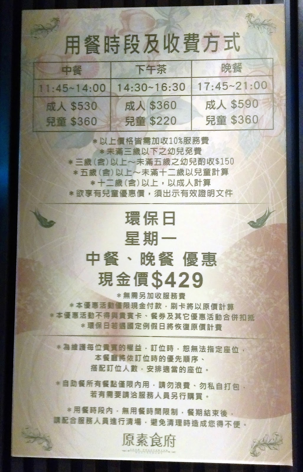 原素食府用餐時段及收費方式