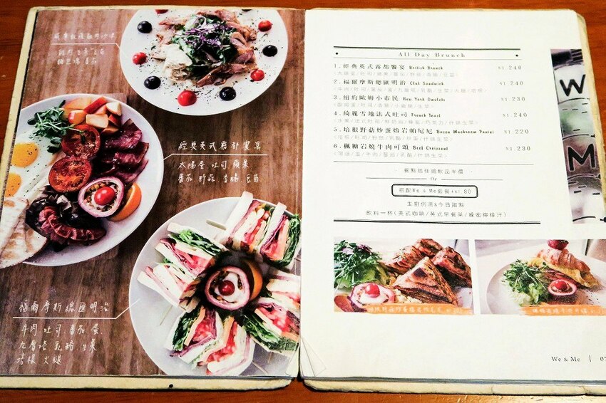 We & Me Cafe提供全天候的早午餐、輕食、義大利麵/燉飯、下午茶甜點、咖啡、茶飲跟現打果汁,餐點皆可加價升級成套餐。