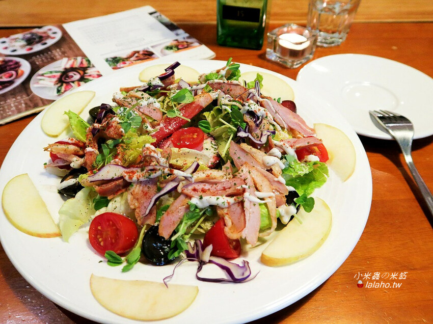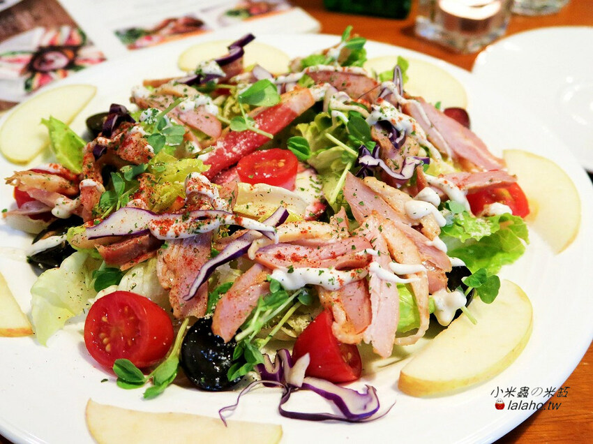 除了有新鮮生脆的蘿蔓、紫生菜,還有多汁的小葡萄、小番茄、甜脆的蘋果,搭上鮮嫩的燻雞肉