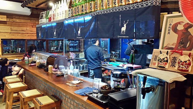狹長型的店內比較多雙人對坐,大量的木頭式設計與昏暗的燈光也營造出不少日式居酒屋的氛圍。