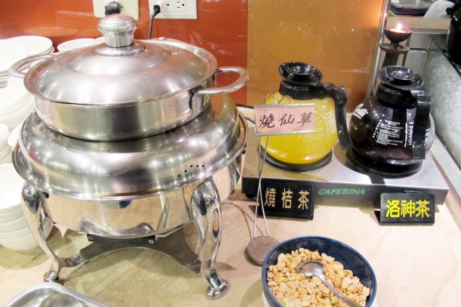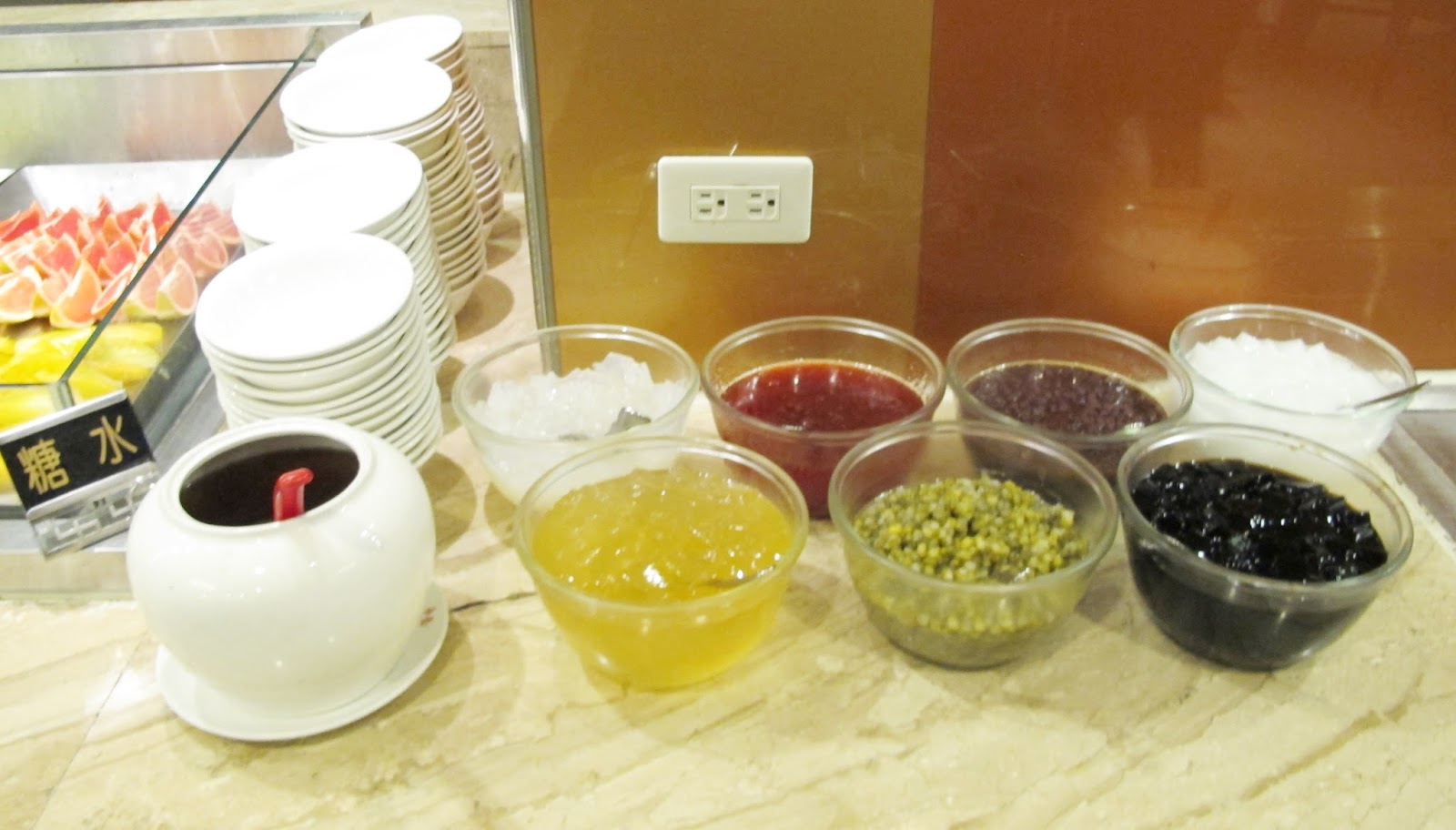甜品區,有杏仁湯、花生湯、薑汁湯圓、燒仙草、、等