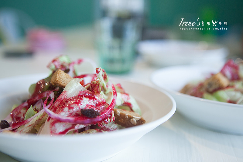 套餐所附的生菜沙拉,艷紫紅色的醬汁沾染著翠綠的生菜,有別於普通的千島、和風醬,