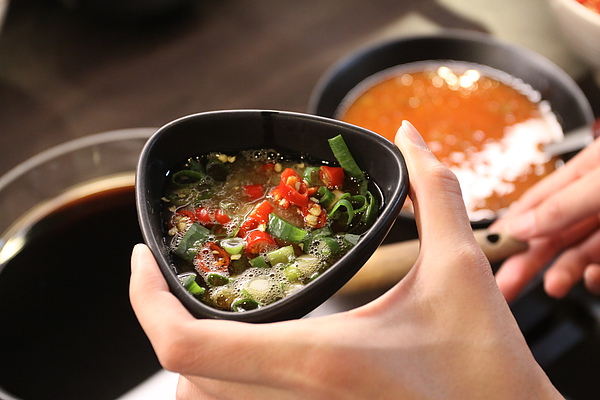 這是愛喵的特製醬汁,有辣椒蔥花白蘿蔔泥跟醋,吃起來又酸又有勁