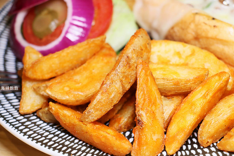 旁邊有生菜、洋蔥及蕃茄