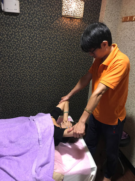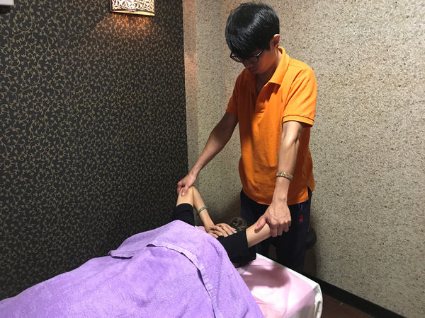 按摩師以到位的技巧順著身體肌肉按壓推揉