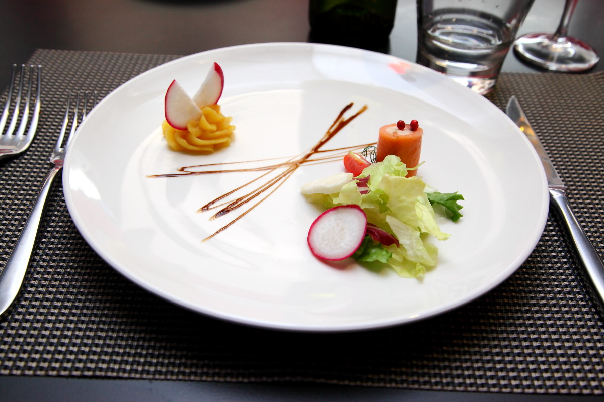 盤飾新鮮水嫩的生菜,加上擠花地瓜泥,鹹鮮Q軟的燻鮭包裹著香滑細緻的幕斯,吃起來相當爽口開胃