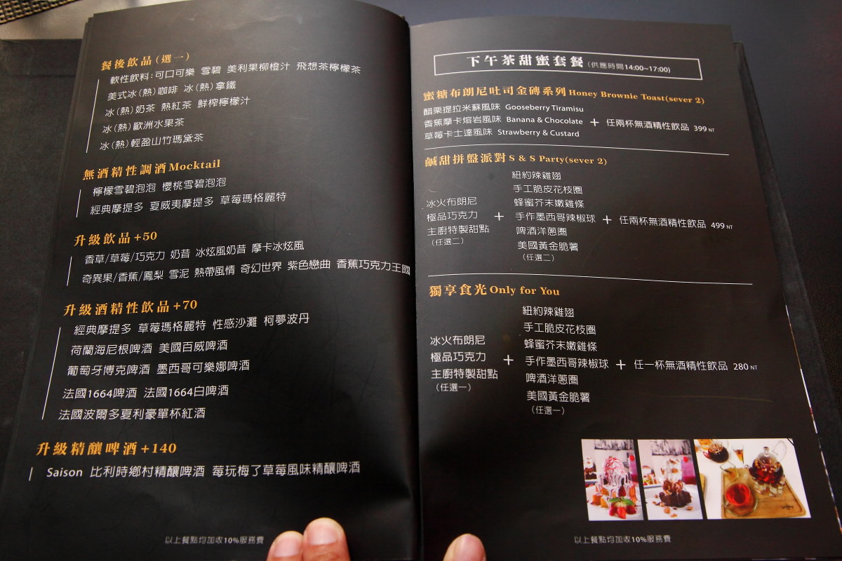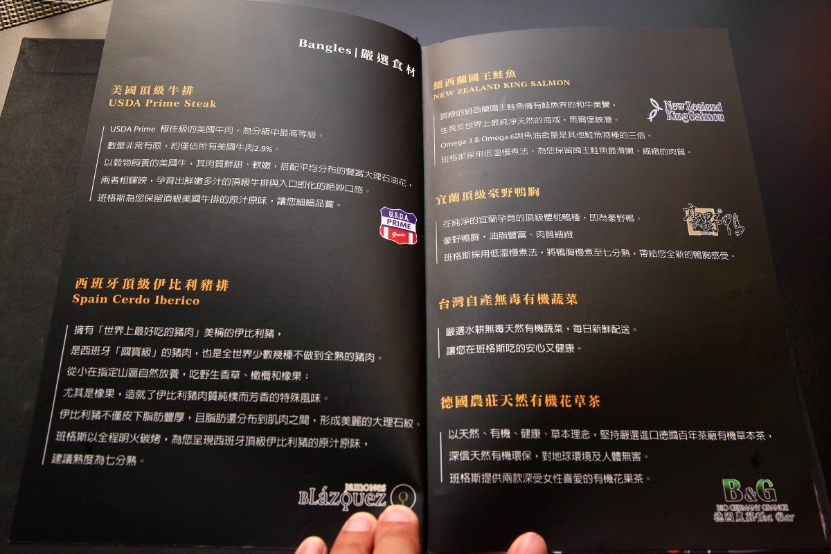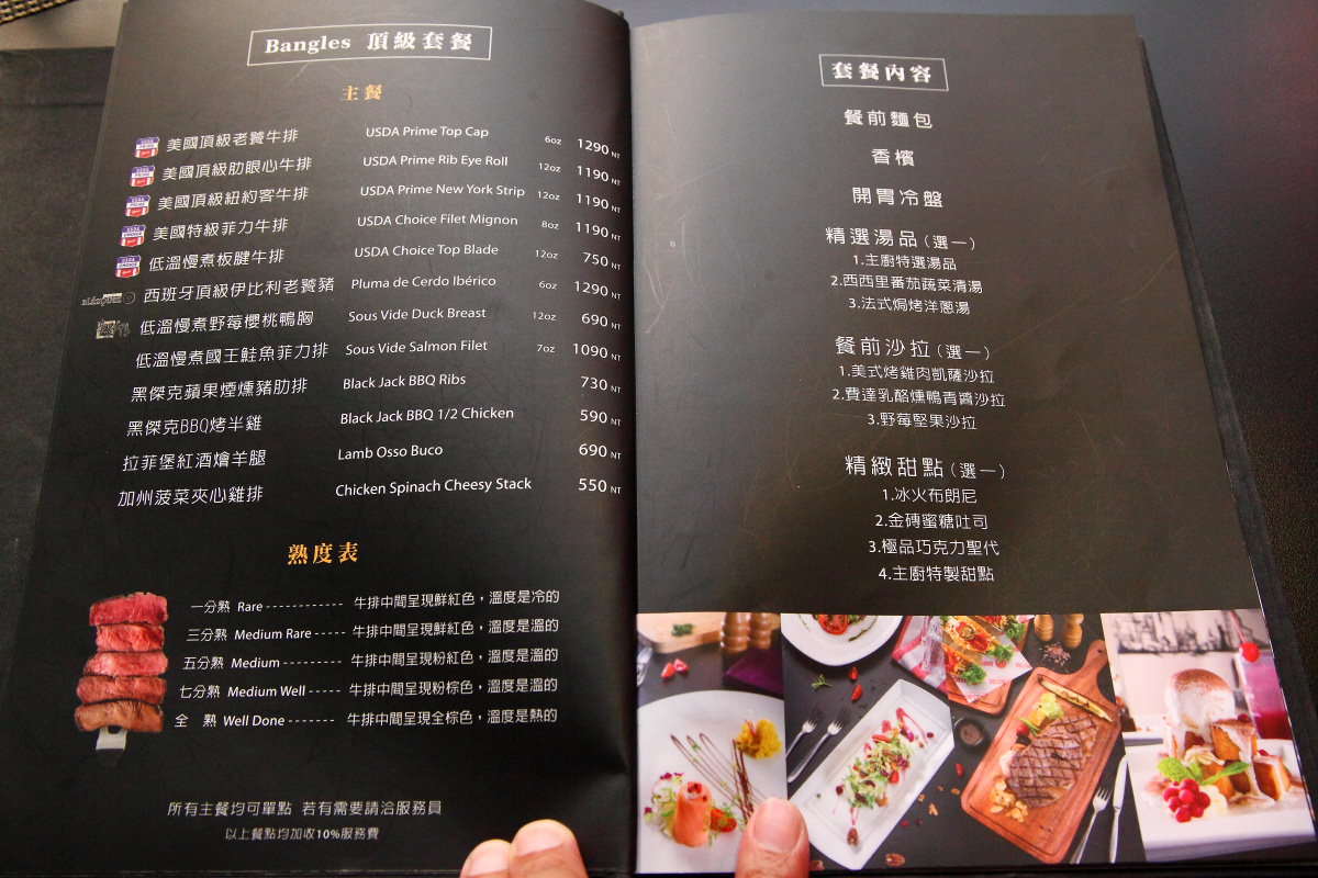 菜單,Bangles Bistro 班格斯西式餐館主要以套餐為主,使用的食材等級也相當高檔,除了U.S. Prime美國頂級牛排還有難得一見的紐西蘭國王鮭魚、西班牙伊比利豬、宜蘭頂級豪野鴨胸等等,套餐包含餐前麵包、香檳、開胃冷盤、湯品、餐前沙拉、飲料、甜點,午間套餐只要850元就可以品嘗到頂級的U.S. Prime美國頂級牛排惹!