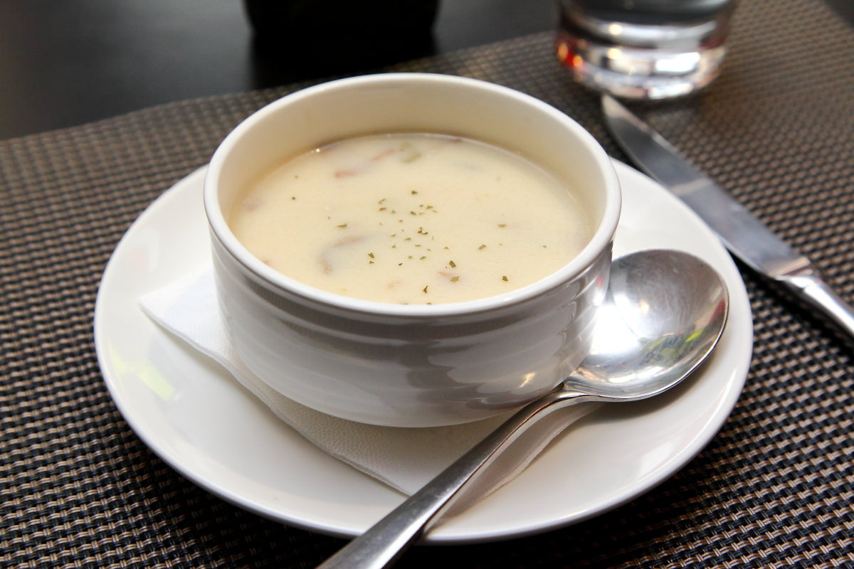主廚濃湯,今天是磨菇培根濃湯,喝起來有著淡淡的奶香,湯裡加入了炒香的培根提鮮,蘑菇甜、培根鮮,還加入了脆口的西洋芹增添口感