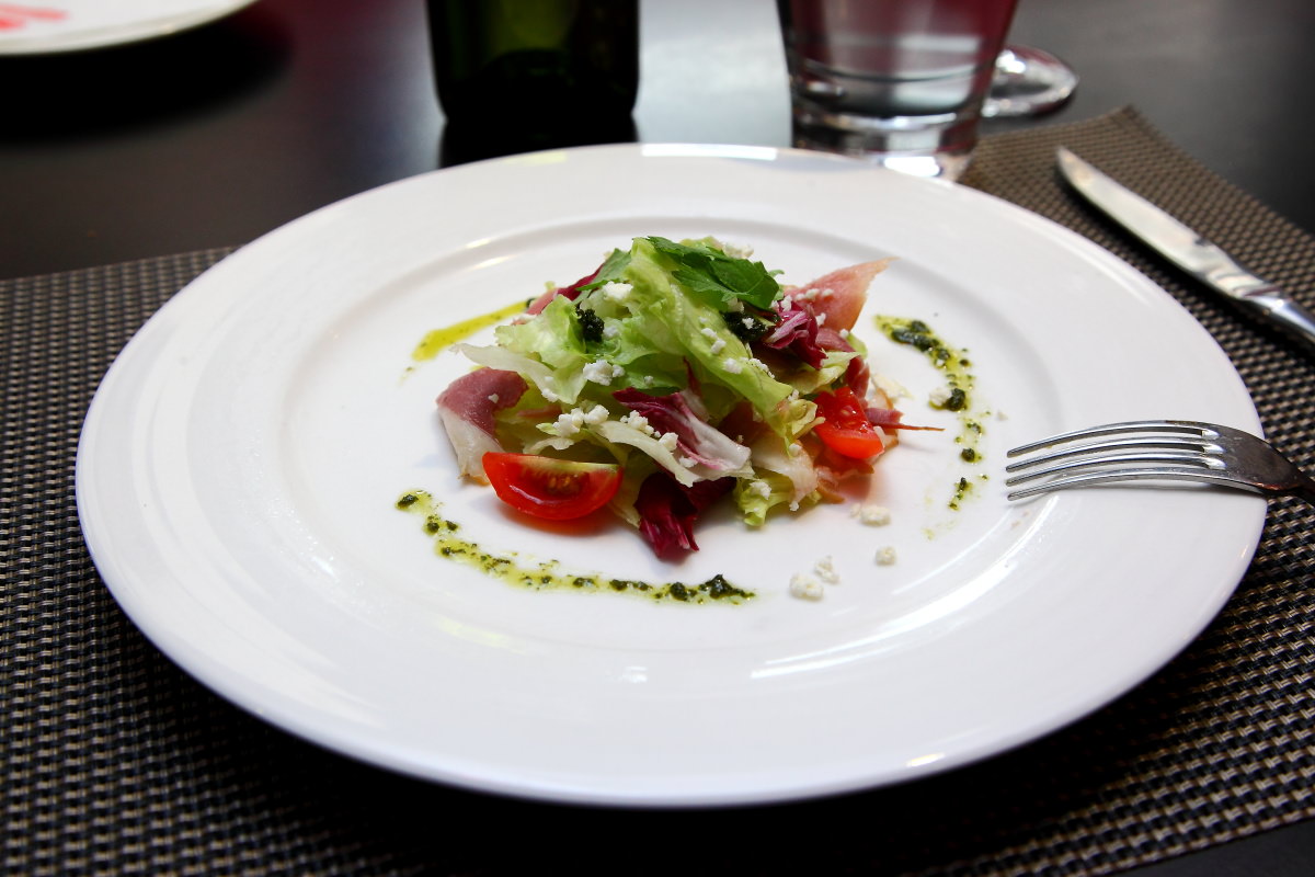 用青醬當作沙拉醬料倒是很少見,上面一粒粒白色的是費達乳酪