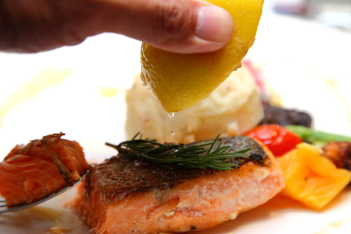 吃完原味可以擠上一點烤過的黃檸檬,因為綠檸檬的香氣及酸度都較為強烈,會壓過國王鮭魚的鮮味,加上黃檸檬汁的國王鮭更增添果香風味,更加誘發食慾,太讚了!