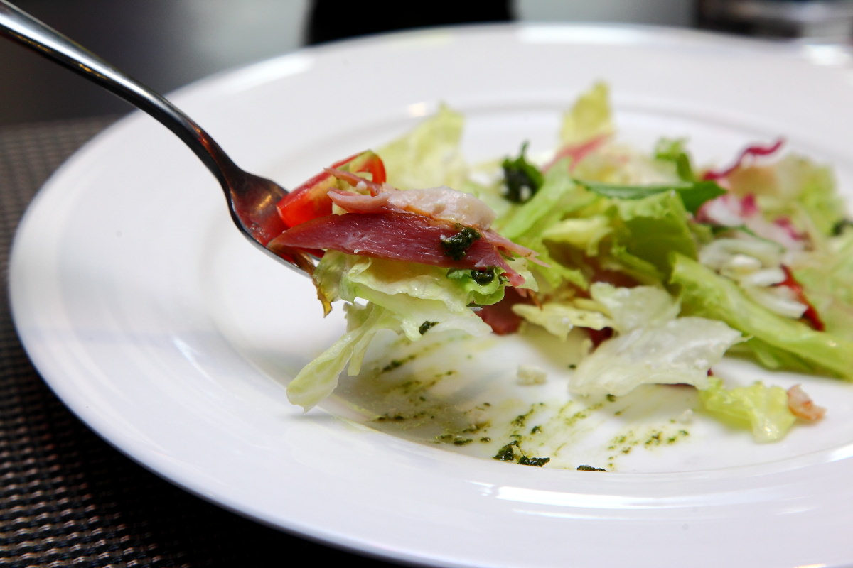 吃之前先將生菜、乳酪、切薄的燻鴨片與青醬拌勻,青醬淡雅的風味勾出燻鴨的鹹鮮,費達乳酪吃起來有著濃厚的乳香氣,口感微鹹入口即化,搭配爽脆的生菜口感味道相當有層次感